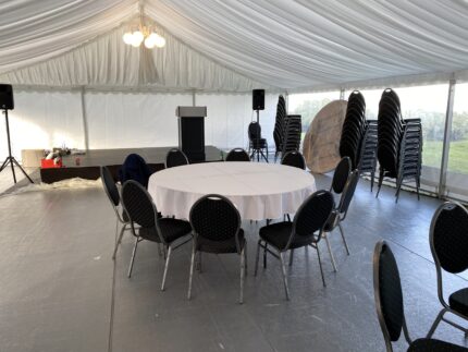 Komplet løsning til 100 gæster. 14 runde borde og 100 banquet stole.