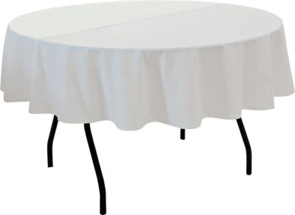 Dug til runde borde med diameter på 160 cm. Dugen er 240 cm i diameter. Rens efter endt leje incl. i pris.