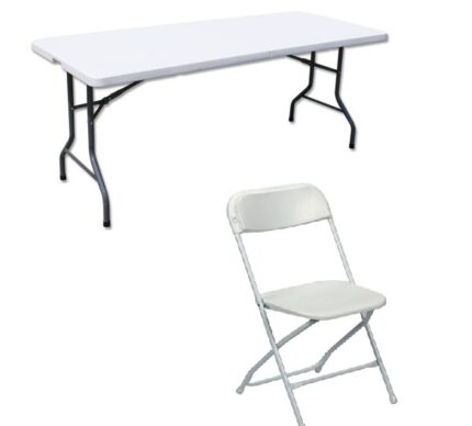 Lej en komplet pakke med 96 stole (på praktisk vogn) og 14 182 cm borde (i praktisk transport vogn) til festen! Pæne solide hvide klapstole og grå letvægtsborde udlejes billigt.