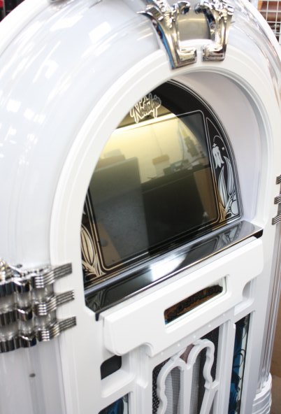 Vores flotte Digitale Nostalgi jukeboks. Denne model er i en flot moderne Hvid farve. Indeholder mere end 7000 hits fra 50erne og frem til tidens toner. Giver en god lyd og ekstra højtalere kan tilsluttes. Nem at bruge for alle aldre, spiller nummerne i den rækkefølge de indtastes og blander selv hvis der ikke er noget indtastet. Mulighed for tilslutning af mikrofon og Ipod stik (ekstra). Jukeboksen er 152*82*64 cm og vejer ca. 180 kg. Kan ikke leveres på trapper. Se vores jukeboks i brug her: