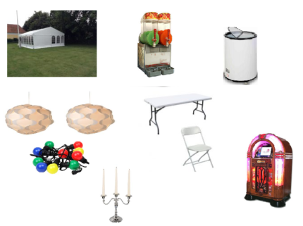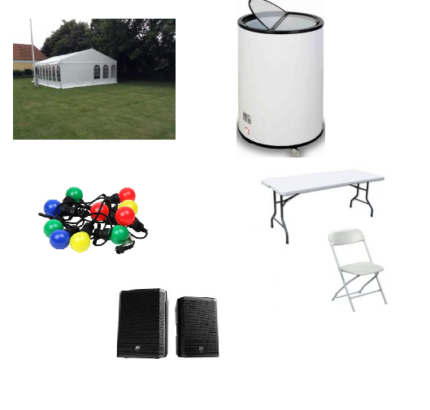 6*9 m telt med gulv leje og montering Loftlys 2 stk Lyskæde 48 klapstole + 7 borde 7 stk 3 armede lysestager Jukeboks Nostalgi 2 kammer slush maskine med forbrug til 50 gæster Køletønde til drikkevarer