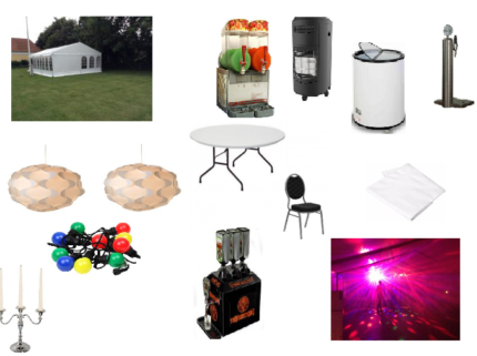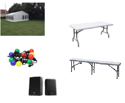 6*12 m telt med gulv leje og montering Loftlys 1 stk Lyskæde 50 Banquet stole 7 runde borde DJ med lyd lys i 4 timer 2 kammer slush med forbrug 50 pax 1 køletønde 1 hane fadøl med 1 fad øl 7 stk 3 armede lysestager Gasovn, 2 stk. excl. gas. Jagermeister Maskine 7 Hvide duge