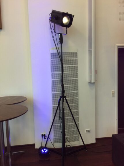 Lækker lampe sæt til belysning af scene eller messestand. Sættet indeholder: -2 stk. kraftige frensnell scenelamper til frontlys på hver deres stativ (stilles i hver side af scenen). -En styring til at skrue op og ned for lamperne. -Nødvændige kabler. Vi bruger Elumen ZF-100W LED Frensnel lamper til frontlys.