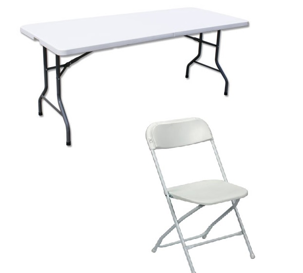 Lej en komplet pakke med 96 stole (på praktisk vogn) og 14 borde (i praktisk transport vogn) til festen! Pæne solide hvide klapstole og grå letvægtsborde udlejes billigt.