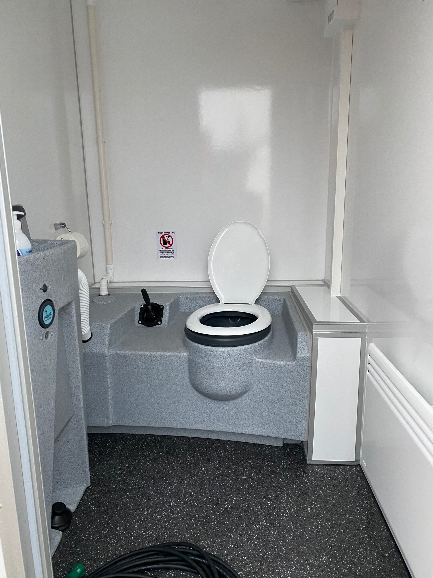 Vognen leveres rengjort og klar til første skyl – dvs. der er sæbe, 1 rulle toilet papir og papir håndklæder i den.